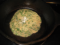 I check Tastespotting every few days for good ideas and new twists on favorites, I found this recipe for spinach parathas. Parathas are new to me, and I made this recipe without knowing anything about them. Instead of sour cream/yogurt and buttermilk with whole wheat flour as I usually use in my tortillas, this recipe calls for sauteed spinach with some aromatics with the simple addition of water to form dough. I do not have a tawa so I just used my cast-iron skillet. I was personally satisfied with the way the dough turned out since it was easy to work with. Please keep in mind that my version is a dairy-less version of my regular tortillas with the addition of spinach. Also, I am just now realizing that the spinach mixture should be folded inside, I guess you learn as you go. I liked the addition of spinach for the added nutrition and flavor. I now need to experiment more to figure out how to get these more pliable for folding and rolling. I wonder if I should change up the type of flour I used.